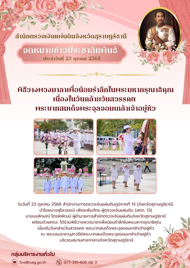 สำนักงานการตรวจเงินแผ่นดินภูมิภาคที่ ๑๓ (จังหวัดสุราษฎร์ธานี) และสำนักตรวจเงินแผ่นดินจังหวัดในเขตพื้นที่รับผิดชอบ ร่วมพิธีวางพวงมาลาน้อมรำลึกพระมหากรุณาธิคุณพระบาทสมเด็จพระจุลจอมเกล้าเจ้าอยู่หัว รัชกาลที่ ๕ เนื่องในวันปิยมหาราช