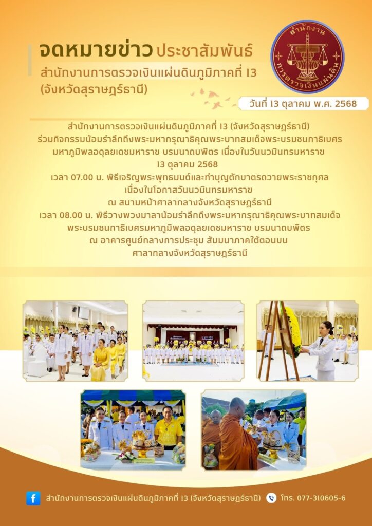 สำนักงานการตรวจเงินแผ่นดินภูมิภาคที่ ๑๓ (จังหวัดสุราษฎร์ธานี) และสำนักตรวจเงินแผ่นดินจังหวัดในเขตพื้นที่รับผิดชอบ ร่วมพิธีเจริญพระพุทธมนต์และทำบุญตักบาตร เพื่อถวายเป็นพระราชกุศล และร่วมพิธีวางพวงมาลา เนื่องในวันนวมินทรมหาราชพระบาทสมเด็จพระบรมชนกาธิเบศร มหาภูมิพลอดุลยเดชมหาราช บรมนาถบพิตร
